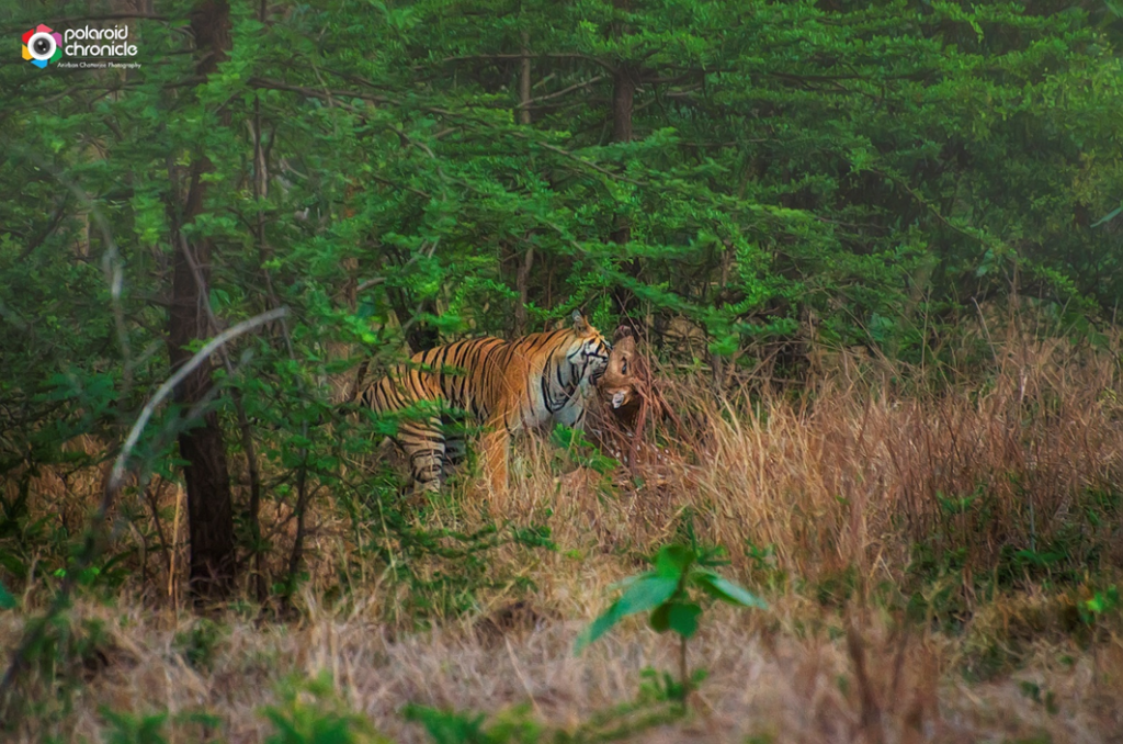 Then came the roar, deep and commanding, reverberating through the dense foliage beyond the bushes. Moments later, a piercing shriek shattered the stillness, and a flurry of wild boars bolted from the undergrowth, scattering in frantic retreat. And there she was—Babli, her yellow stripes flashing between the trees. She had just hunted a boar. Unbothered by our presence, she slipped further into the jungle, disappearing into the shadows to savour her meal. It was clear—she wouldn’t be stepping out for an audience soon enough. We waited, lingering in quiet hope, before finally moving on, somehow content in the knowledge that we had witnessed some streak of the raw and untamed essence of the wild.