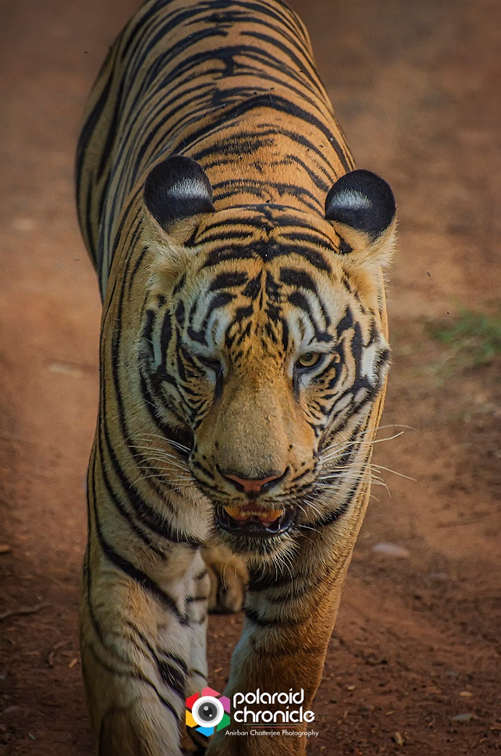 Barely five minutes into the forest, the stillness parted—and there he was. Veer, the mighty, yellow-striped beauty of Madnapur, emerged into view. Still not a full-grown adult, he was the embodiment of feline grace, composed striding down the path with an unhurried confidence.  What followed was a mesmerizing 15-minute encounter, a spellbinding stretch of time. Unbothered by our presence, he walked directly toward us, unflinching, enjoying all the attention and spot light.